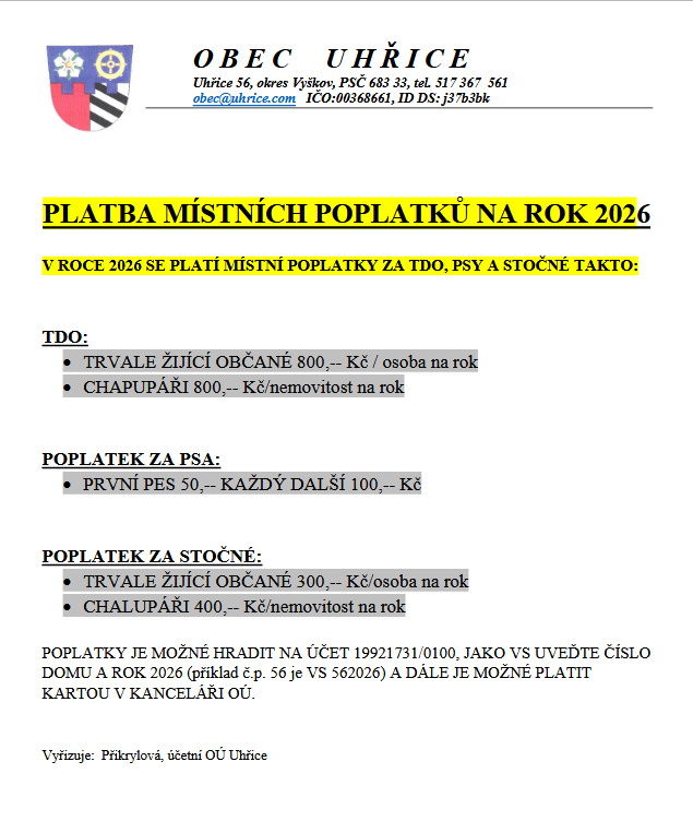 PLATBA MÍSTNÍCH POPLATKŮ V ROCE 2026